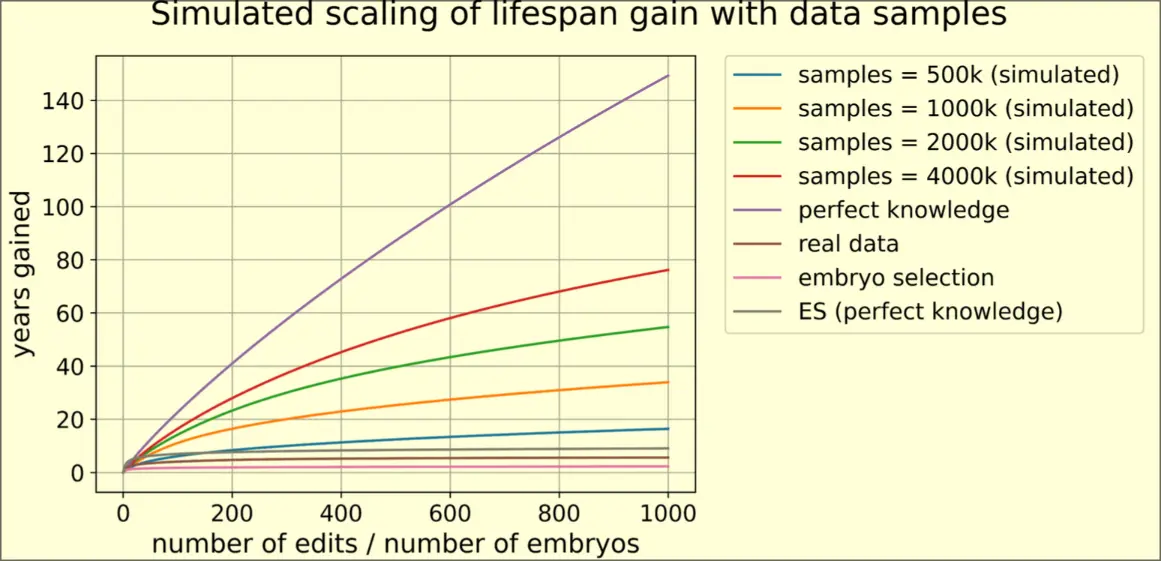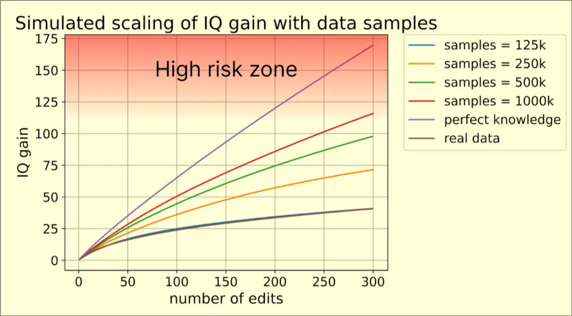 With increased data fed into gene editing Machine Learning algorithms, the gain increases close to linearly based off data quality.