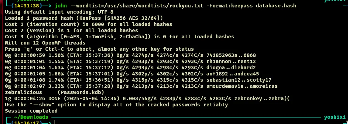 keepass2john Passwords.kdb >> database.hashjohn --wordlist=/usr/share/wordlists/rockyou.txt -format:keepass database.hash