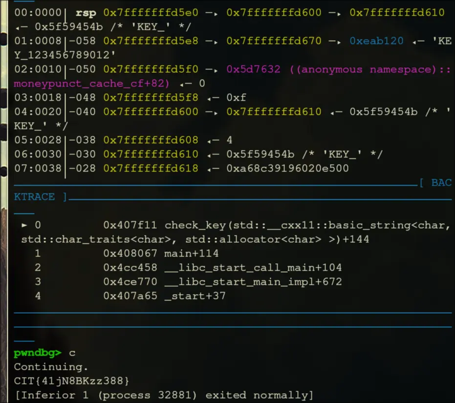 Check if the input has length 16. The first 4 characters must be KEY_ After continuing 16 times, the program will print the flag CIT{41jN8BKzz388}