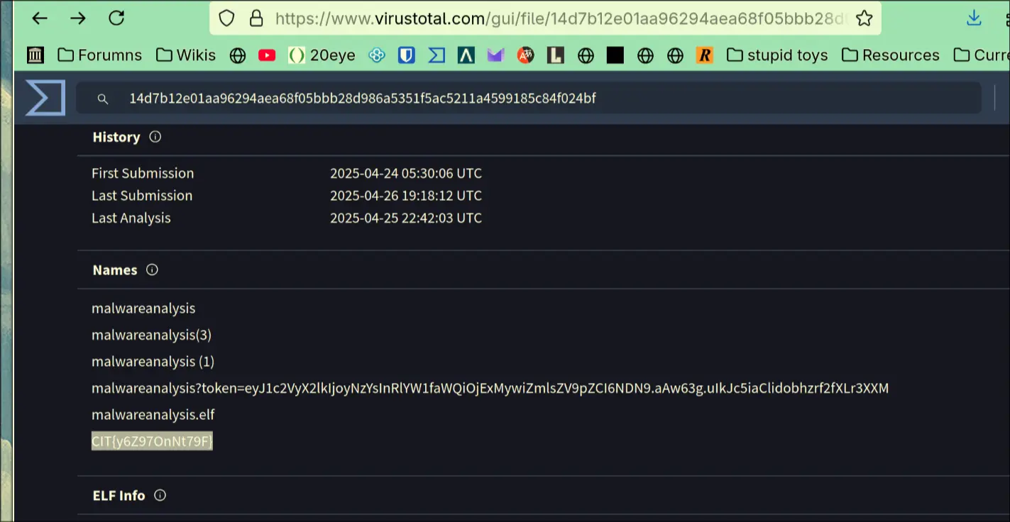 Just toss the file into virustotal and you find a file signature CIT{y6Z97OnNt79F}