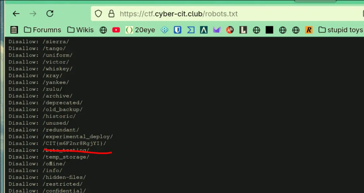 We go to robots.txt https://ctf.cyber-cit.club/robots.txt It is here CIT{m6F2nr8RgjYI}