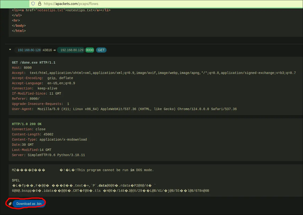 I downloaded the pcap and opened it in apackets.com and downloaded the binary