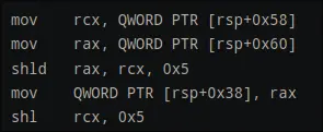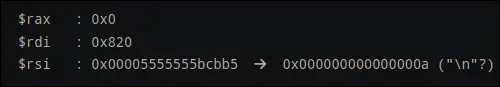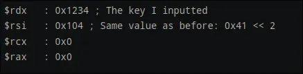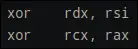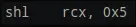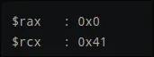 rcx contains byte of message (Ain this case) rax contains0 - 5th instructions shift