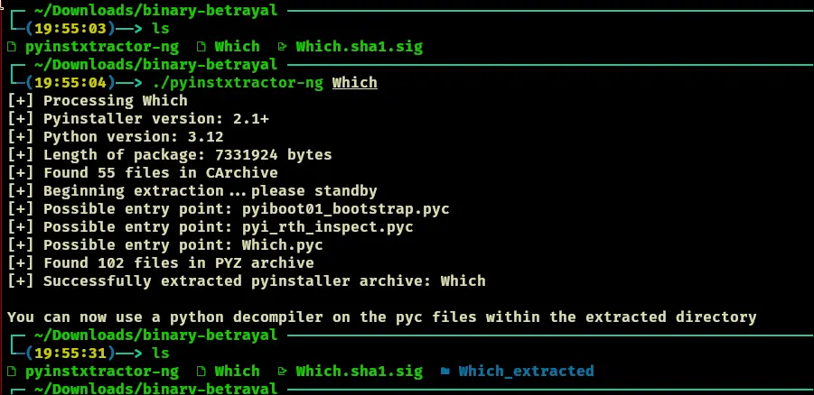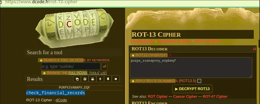# Decompiled with PyLingual (https://pylingual.io)# Internal filename: Which.py# Bytecode version: 3.12.0rc2 (3531)# Source timestamp: 1970-01-01 00:00:00 UTC (0)import mathimport randomdef main(): Legal_troubles()def competitor_file(a, b): result = 0 str = 'magpieCTF{Ro+_7hir+een}' for i in range(1, 50): result += a * i % b return resultdef operations_planning(): x = random.randint(1, 100) y = random.randint(1, 50) for _ in range(25): str = 'magpieCTF{Rever5e_7he_[ode}' z = competitor_file(x, y) if z % 2 == 0: x = z * 3 % 50 else: y = (z + x) % 75def Legal_troubles(): anflag = 'purpx_svanapvny_erpbeqf' str = 'magpieCTF{D3c0d1ng_FuN}' aflag = f'flag-{anflag}' output_lines = ['running?{' + aflag + '}', 'about{' + aflag + '}', 'anything{' + aflag + '}', 'said{' + aflag + '}', 'Who{' + aflag + '}'] for line in output_lines: print(line) financial_records(str)def operational_costs(x): for i in range(1, 37): x ^= i * (x % 7) + (i << 2) return x * 3 % 12345def financial_records(data): temp = [ord(char) for char in data] for _ in range(5): temp = [(val * 7 >> 3) % 256 for val in temp] str = 'magpieCTF{Rich_3nou9h_7o_$+@y_C1e@n}' print(''.join([chr(val) for val in temp])) return ''.join([chr(val) for val in temp])def resolution_notes(a, b, c): result = 0 for i in range(1, 13): temp = math.sqrt(a * i % b + c) if int(temp) % 2 == 0: str = 'magpieCTF{N0t_Th3_R34L_Fl4g}' result += int(temp) else: result ^= i return resultdef data_warehousing(n): arr = [n] for i in range(1, 256): arr.append(arr[-1] * i % 10007) while len(arr) > 1: arr = [arr[i] + arr[i + 1] for i in range(0, len(arr) - 1, 2)] return arr[0]def confusing_money_drain(data): return ''.join([chr(ord(char) * 3 % 256 ^ 7) for char in data])def distraction_toys(): noise = [random.randint(0, 100) for _ in range(50)] for i in range(len(noise)): noise[i] = (noise[i] * 17 + i) % 256 if noise[i] % 3 == 0: noise[i] ^= i * 7 return sum(noise)if __name__ == '__main__': str = 'magpieCTF{N07_57_3n0ugh}' main()def hidden_Stash(data): key = 42 for char in data: key = key * ord(char) % 98765 return keydef family_mess(encoded): intermediate = ''.join([chr((ord(char) - 7) // 3 % 256) for char in encoded]) str = 'magpieCTF{C0d3_3xp0s3d}' return ''.join(reversed(intermediate))def directors_removed(x, y, z): if z % 3 == 0: return x * y - z return x ^ y ^ zdef other_business(data): output = '' for char in data: output += chr((ord(char) + 47) % 256 ^ 89) return outputdef legal_business(a, b): c = 'irrelevant' str = 'magpieCTF{R3v3r53_3v3ryth1ng}' return directors_removed(a, b, len(c))