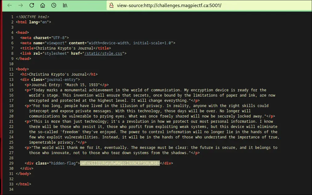 With CTRL+U Convert from base64 magpieCTF{$p1d3r_W4$_H3r3}