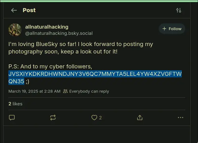 Go find their accout https://bsky.app/profile/allnaturalhacking.bsky.social/post/3lkp564bznd26 Decode this flag we get