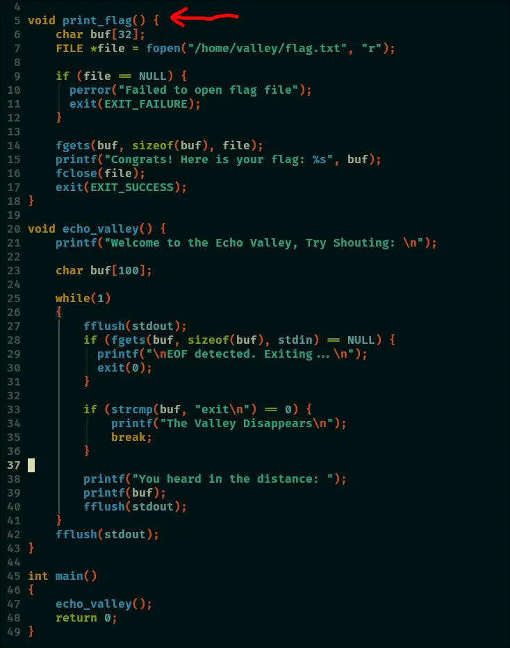 - Modify the return address with Format String Exploitation to be the address where print_flag() is located