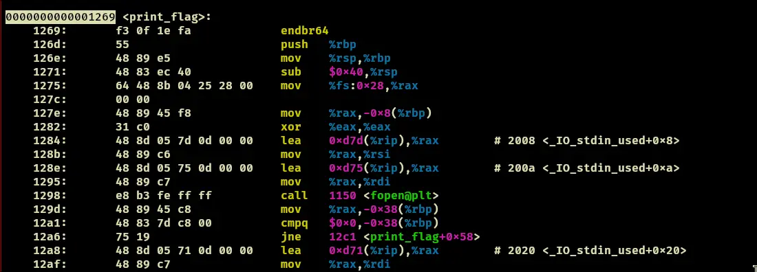 - Leak the base address for print_flag(), the offset for print_flag() is