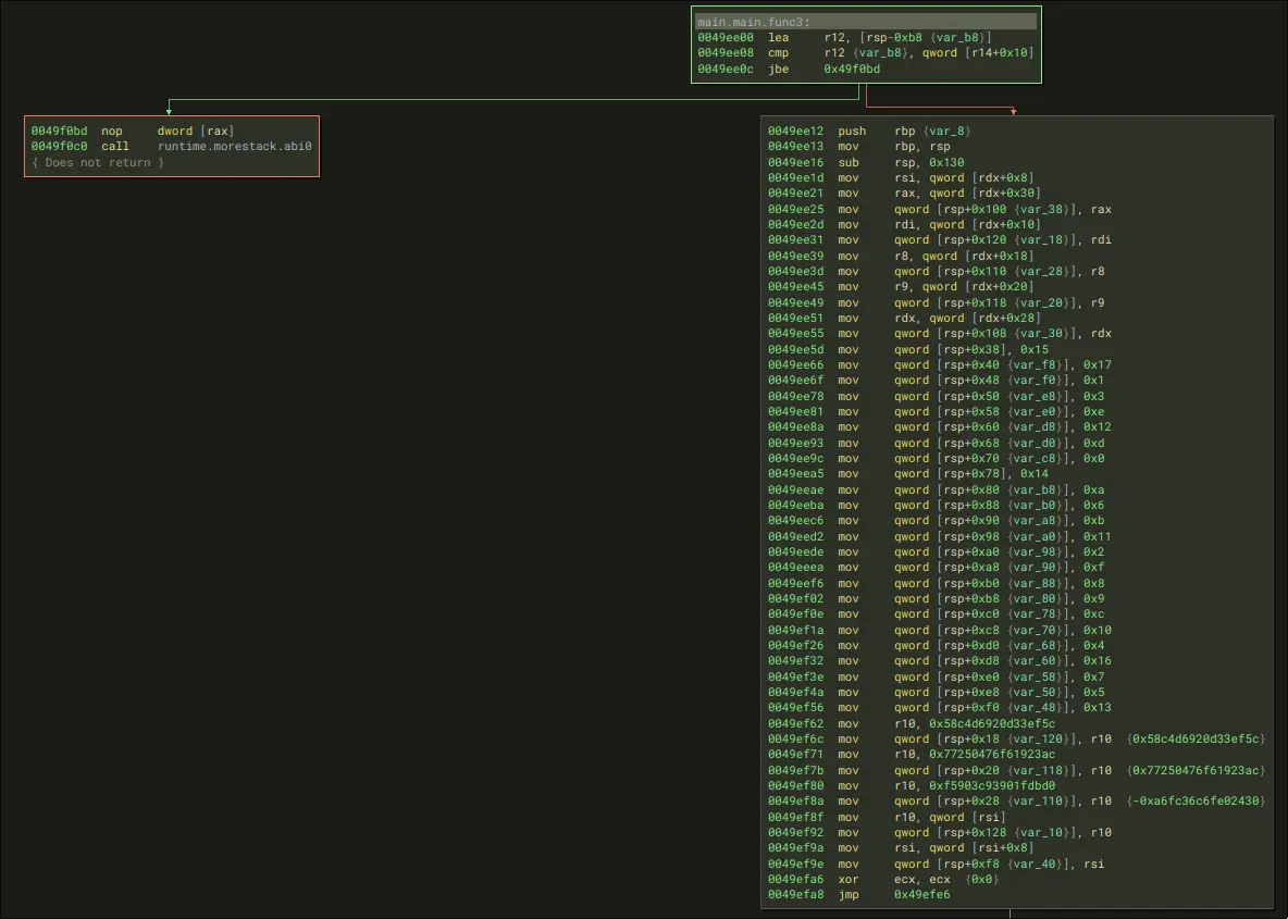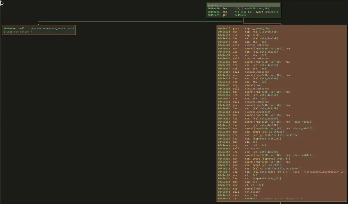 The entry for go programs is main.main. In binary ninja, we get this for main: