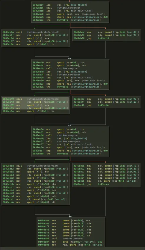 Then, a series of Goroutines are called. A goroutine will have this structure of checking write barriers before every call.