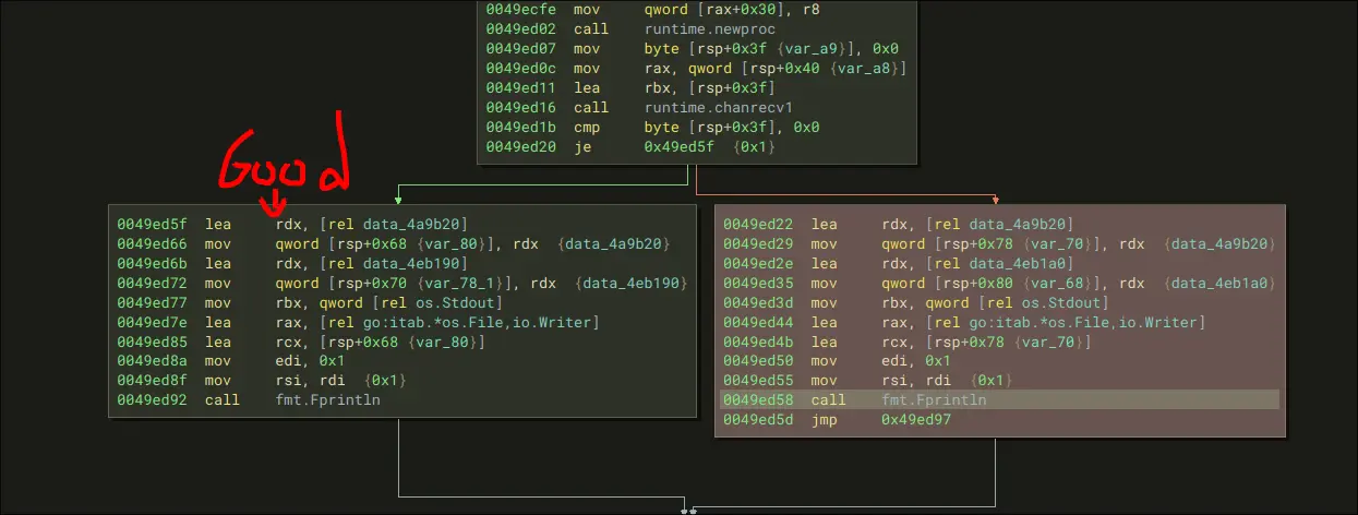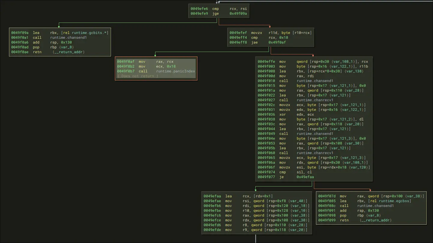 So, in essence, the very last goroutine we call which is main.main.func3 will determine if we win or not.