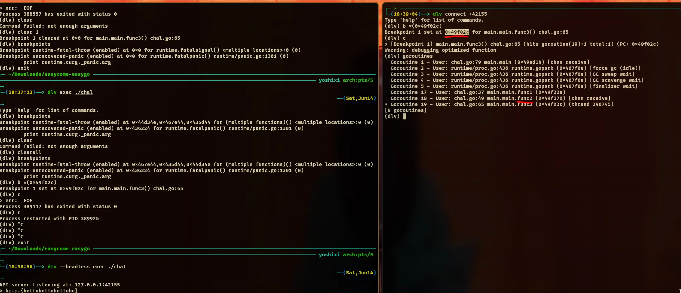 I used Delve to actually see which function was listening to which channel, since GDB had issues with concurrency.