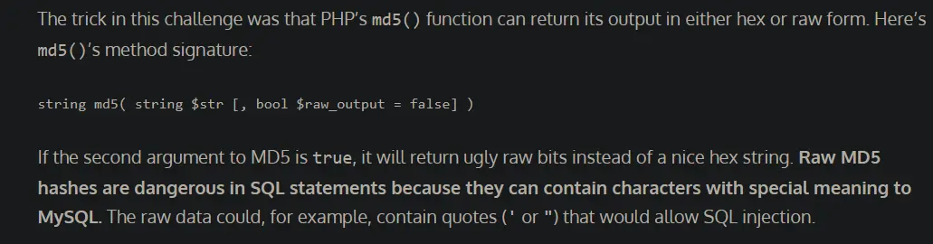 Since md5 is evaluated in raw form, it can contain characters with special meaning to MySQL.