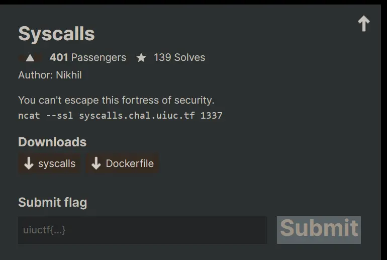 https://uiuctf-2024-rctf-challenge-uploads.storage.googleapis.com/uploads/849d00c7cde64633f69d88a2089d86cb207d28fe05c3eb92bec9013356ec0d85/syscalls https://uiuctf-2024-rctf-challenge-uploads.storage.googleapis.com/uploads/bd29ee29287ad1a656065cc4f4d26093fe3f952c8e6a2e286ff8ad22d079ccdd/Dockerfile