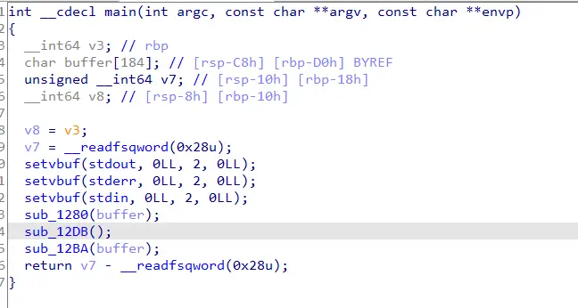 Then, when we load the binary into ghidra to reverse it, we see that its just a simple, take user input, then execute it provided the user input does not have any forbidden syscalls.