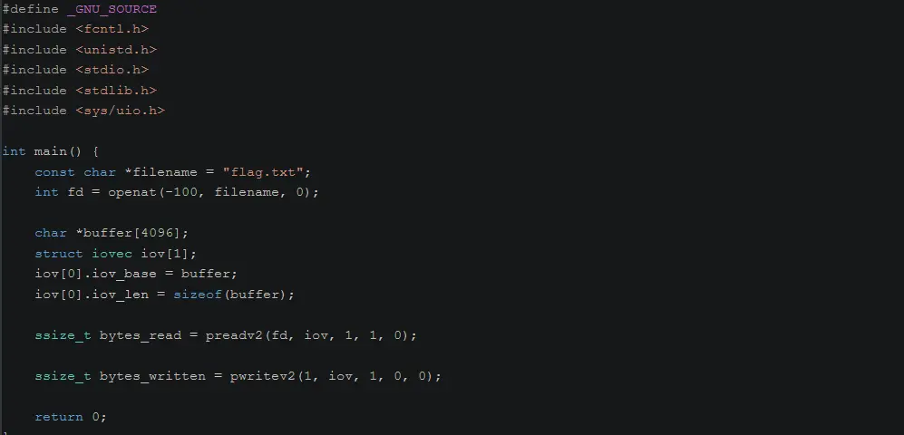 This was the C code to exploit the syscalls openat, preadv2, pwritev2: