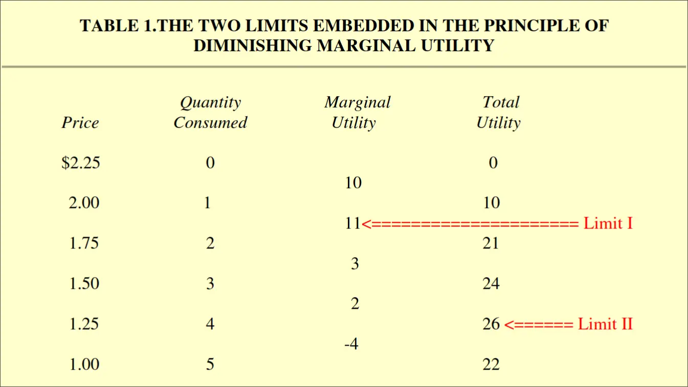 - After a certain point of consumption, the person hits Limit 1. They notice that the increase in total utility diminishes with every additional unit