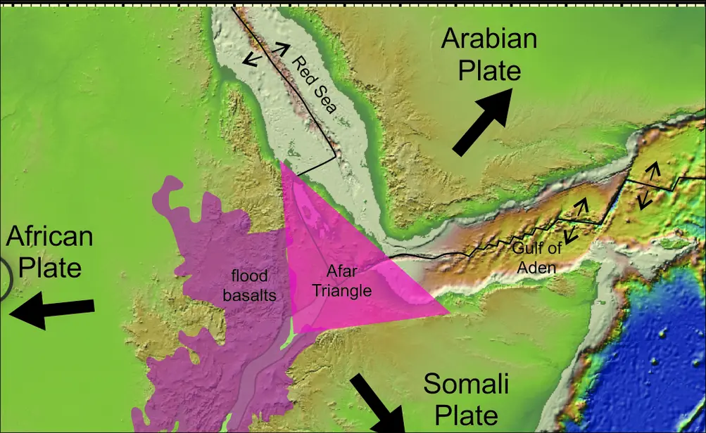 A triangular depression that separates: African plate Somali plate Arabian plate This is an example of a Triple Junction