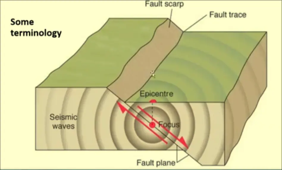 The surface expression of a fault. Often seen when faults are created during Earthquakes
