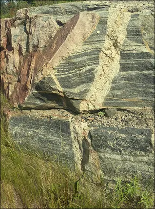 Pink Igneous Rock found along highway 144. Rich in potassium and feldspar. Forms bands of pink
