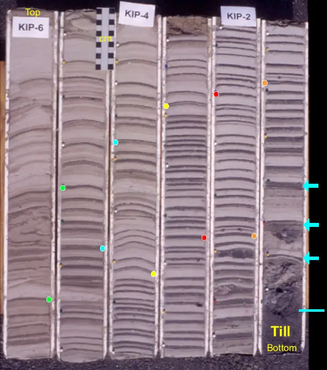 A method of dating minerals up to 10,000 years ago. Count the number of layers of sediment deposited annually