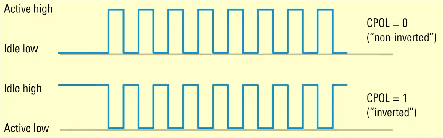 - CPOL = 0 means the leading edge of a clock pulse is at 0