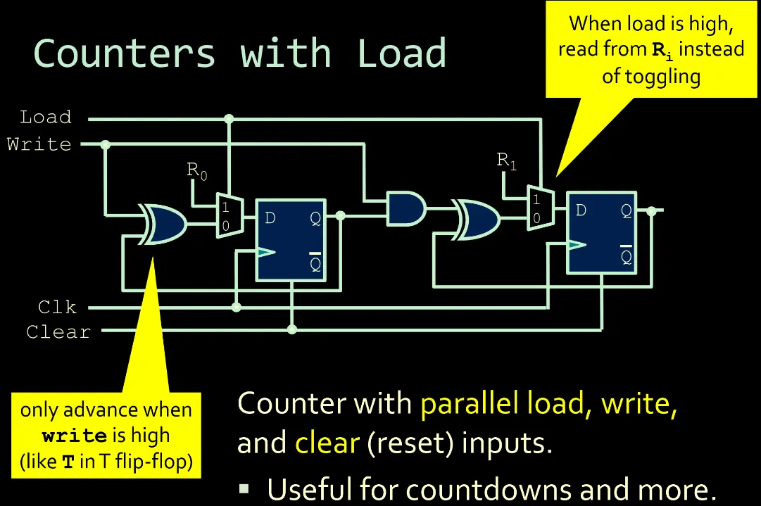 - Act as a Register to load the value It has a load input, counter input, clock and clear to reset the Circuit State to 0.
