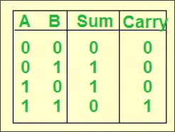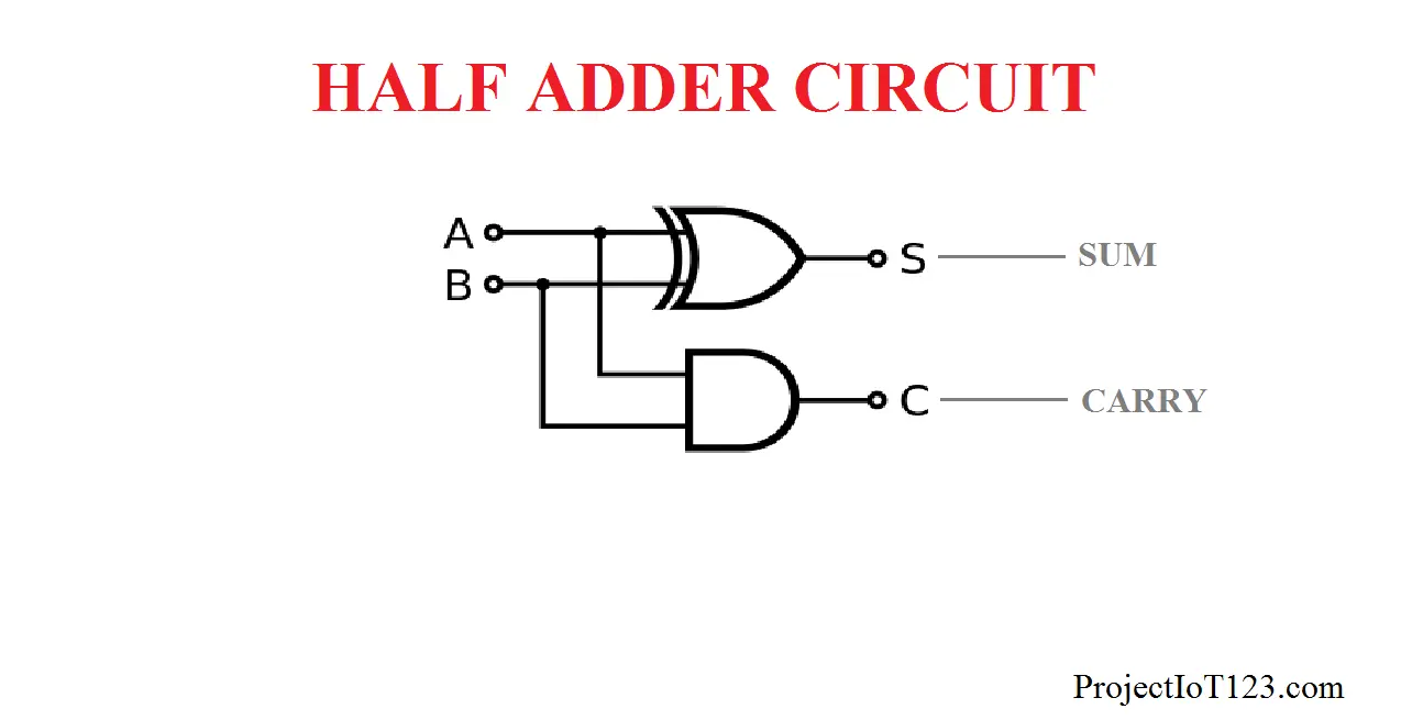 Performs binary addition of two bit inputs A, B. Produces a SUM and CARRY output. Truth Table Circuit Design
