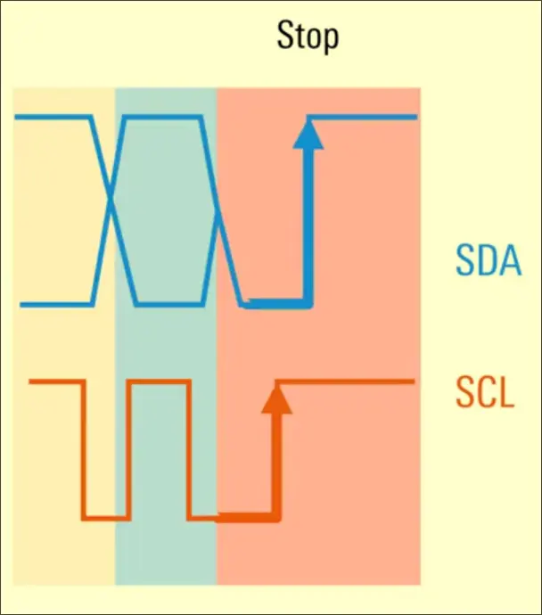 - Stop condition occurs when both SCL and SDA remain high, signalling an idle bus.