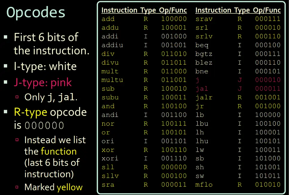 These are the specific operation codes. Differentiated based off MIPS Instruction Types.