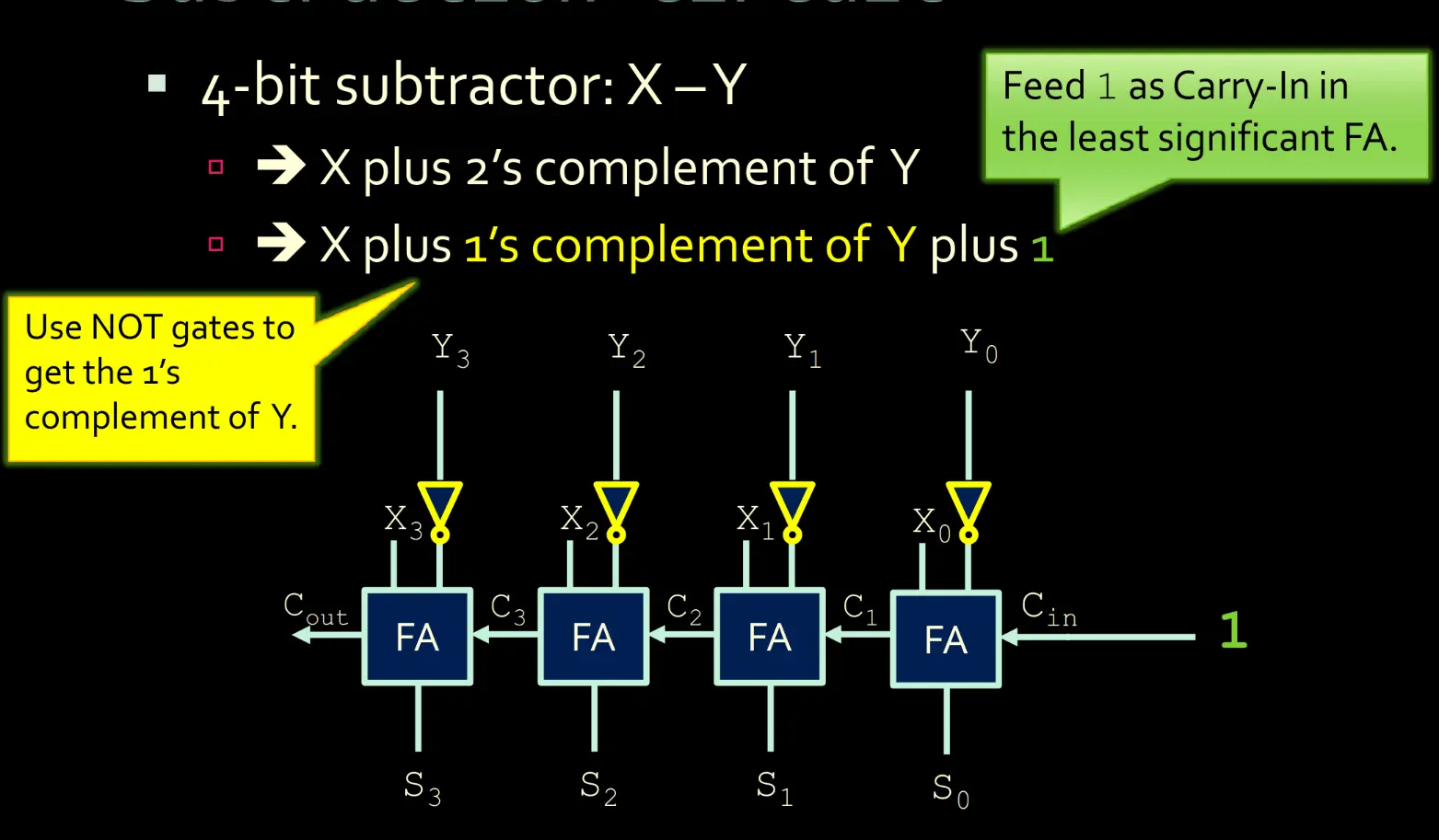 A Logic Gate for subtracting one binary integer from another. Could be created with: X + 2’s Complement Y X + 1’s Complement Y+1 4-Bit Subtractor Design