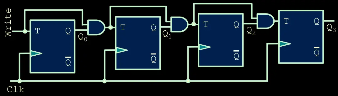 This is a Counter that is a Synchronous Circuit. Circuit Diagram Each flip-flop only changes when all previous flip-flops are set.