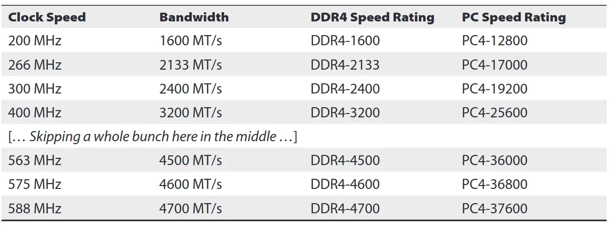 64GB 1.2V. Performance is 1.35V, Low-voltage is 1.05V 288-pin DIMM 260-pin SO-DIMM Bandwidth = 8 * Clock speed Speed rating = 8 * Bandwidth Lowest speed of 2133MHz