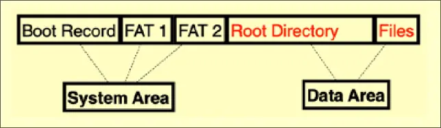 - System area: stores volume boot record and FAT tables