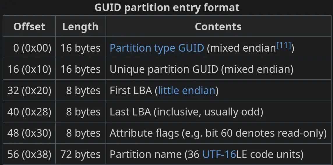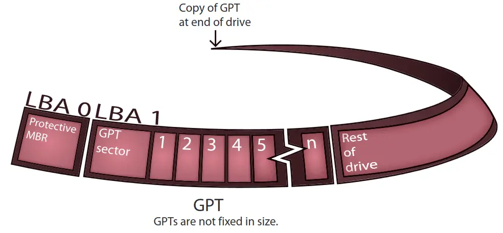 Includes a Pointer to the Partition Entry Array. A GPT Header backup exists in the final LBA aswell.