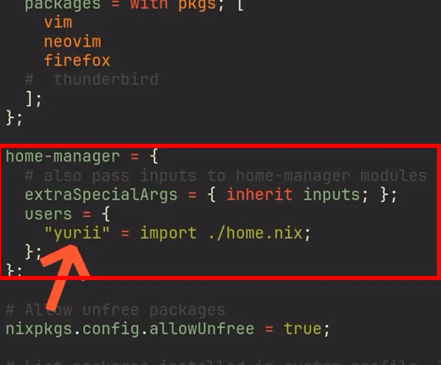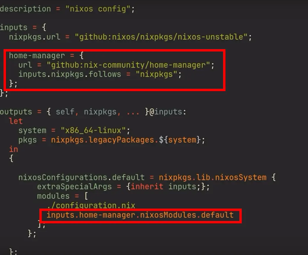 nix run home-manager/master -- init && sudo cp ~/.config/home-manager/home.nix /etc/nixos- Finally rebuild.