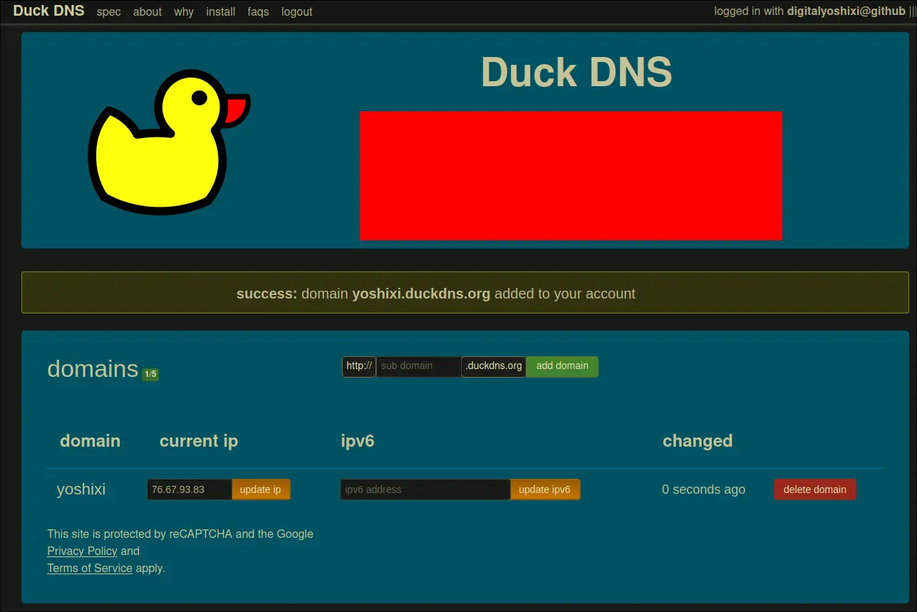 crontab -eand add**/5 * * * * ~/duckdns/duck.sh >/dev/null 2>&1* -