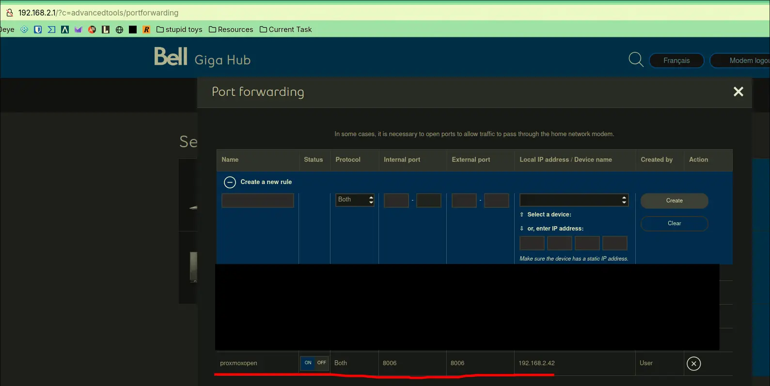 Now, to see if this works, I want to add port forwarding for my proxmox console to see if i can view it from outside.