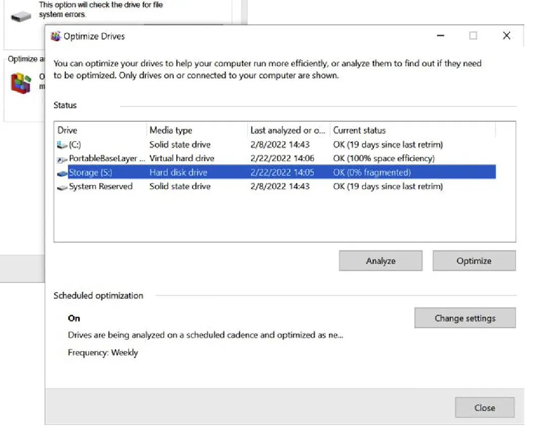A windows tool to remove Fragmenting of memory. Optimize drives will defragment your HDD. defrag <volume> defrag C: