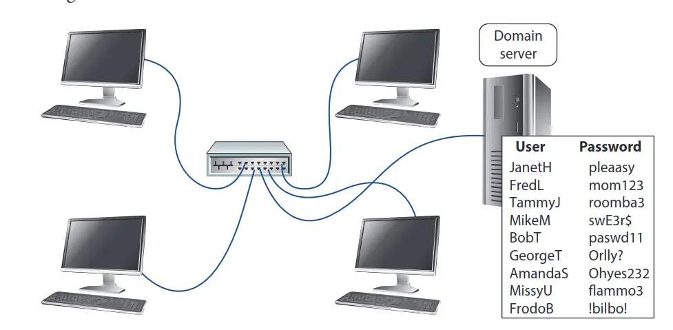 A windows domain server stores all users. All local computers can be logged onto with the users stored in the domain server.