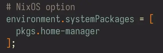 nix run home-manager/master -- init && sudo cp ~/.config/home-manager/home.nix /etc/nixos- Finally rebuild.