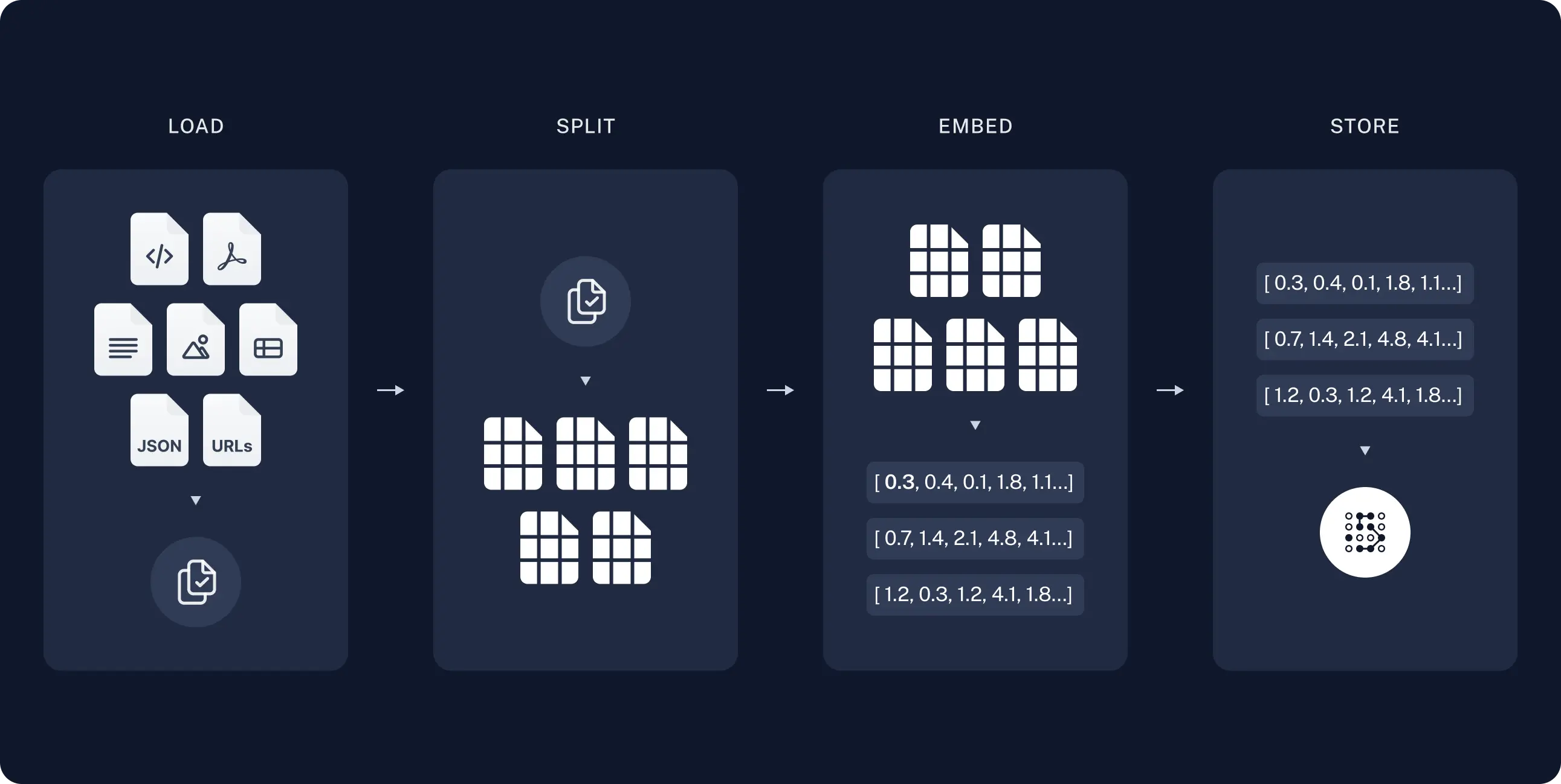 The Indexing process for development of a RAG. Process Load data with a Langchain Document Loader Split text with Langchain Text Splitters Store indexed data with VectorStore
