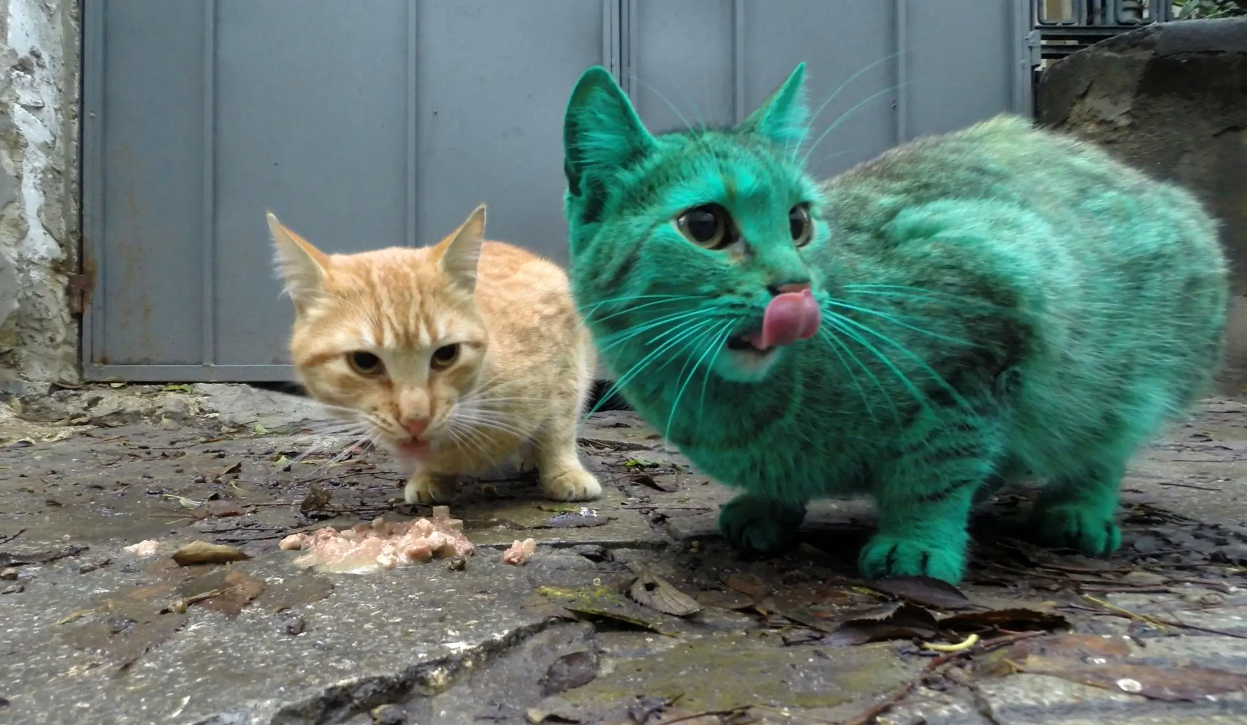 A stray cat that sleeps on a chemical basin, thereby altering its coat color.