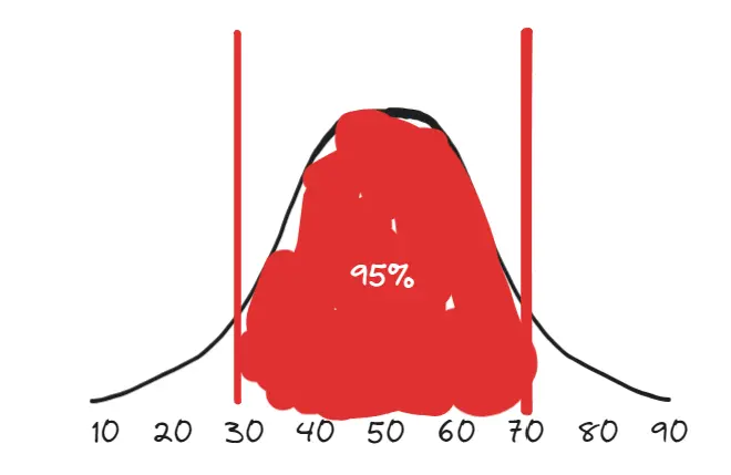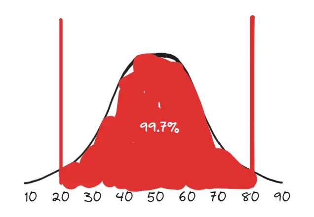 We know 20-80 is 99.7%, then 100-99.7% = 0.03, thats the area from 10-20 and 80-90. then, its divided by 2 so 0.015