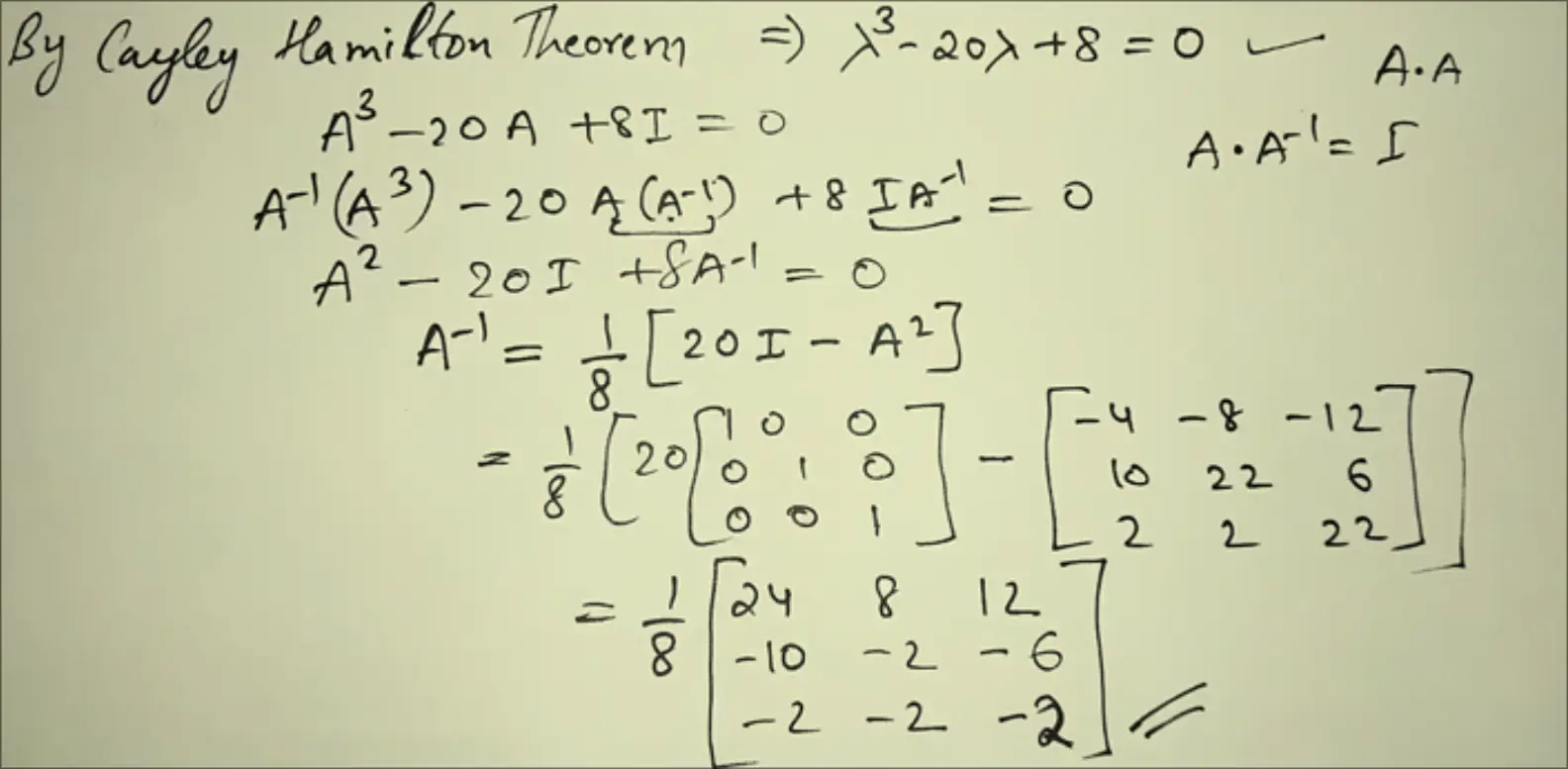 Process Find the Characteristic Polynomial for matrix A Sub-in the matrix A for all instances of λ Multiply by A−1 for all terms, then isolate A−1 Solve for A−1