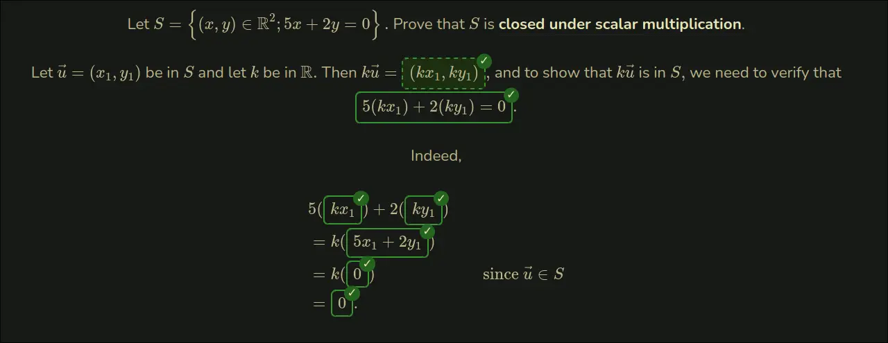 Any scalar multiple of vector x∈S will also be in S (x∈S,k∈R⟹kx∈S)