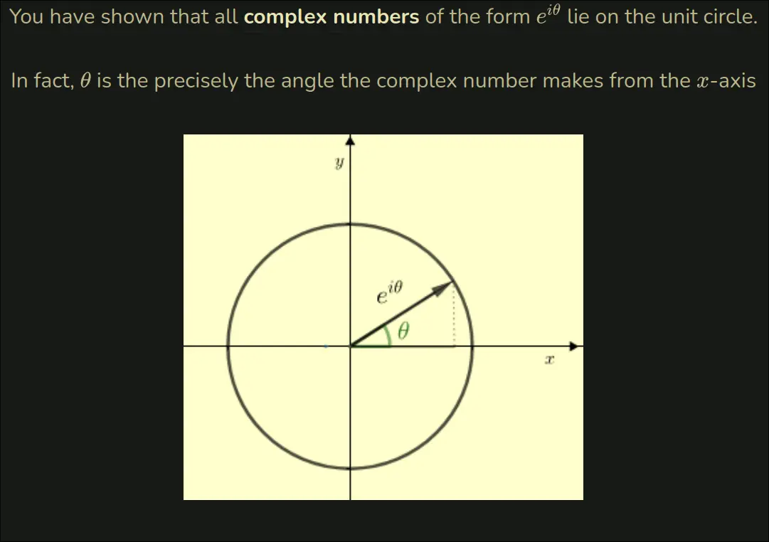 A complex number z is a unit vector if it Complex Number Modulus is 1 ∣z∣=1 Complex numbers of the form eiθ ∀θ∈R,∣eiθ∣=1 Proving e^itheta = 1