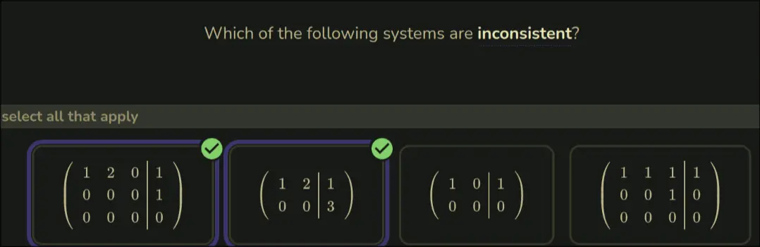A system of equations is inconsistent if: It contains a row of all zeroes that add up to a non-zero constant