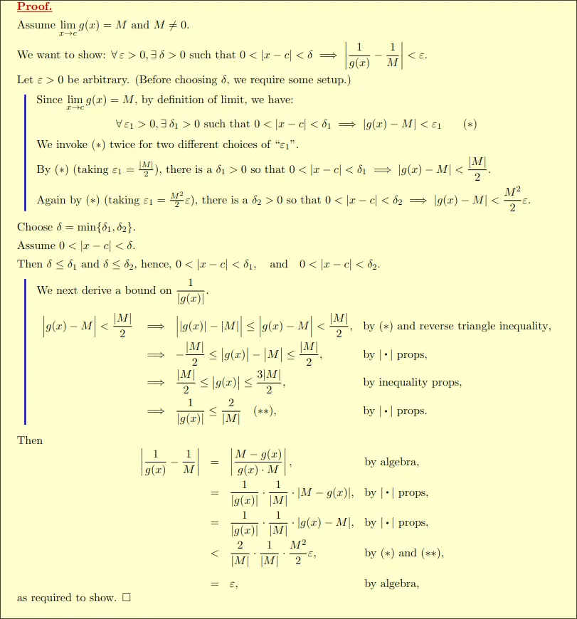 Reciprocal Rule Let M,c∈R and g is defined at an Punctured Interval. If limx→cg(x)=M then limx→cg(x)1=M1 provided M=0. Proof