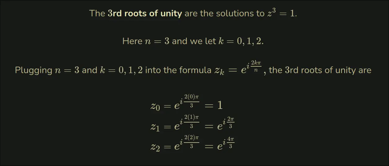 The n solutions would be: {z0ā,z1āā¦znā1ā} given by kā[0,nā1],zkā=ein2kĻā